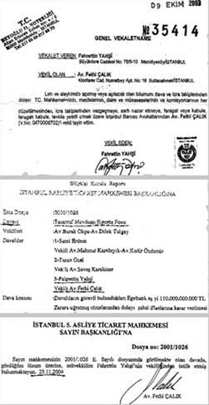 Fahrettin Yahşi, Fethi Çalık’a Beyoğlu 3l. Noterliği’nden 9 Ekim 2003 tarih ve 35414 sayılı vekáletname çıkarıyor.