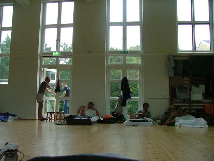 Yatakhane olarak; derslikleri, laboratuarları ve spor salonlarını kullanacaktık, inanın bu çok eğlenceli bir şey…Biz Türkiye erkeklerinin kısmetine spor salonu çıktı. Düşünün 22 erkek arkadaş aynı yerde…Gerçi bizim festivallerde uyku uyumak gibi bir alışkanlığımız yok ama olanlar için , özellikle zurnacımız Erol için kötü bir deneyim olacaktı…