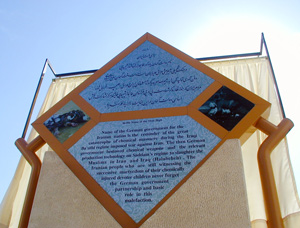 Bugün düzenlenen törenle sergilenmeye başlanan anıt levha üzerinde "Alman Devletinin adı, İran halkına, İran - Irak savaşı sırasında meydana gelen büyük kimyasal faciayı hatırlatıyor. İran ve Irak halkı Almanya’nın o dönemdeki hükümetinin Saddam rejimine hediye ettiği, kimyasal silah üretme bilimi ve kimyasal silahların kurbanıdır. Her gün kimyasal silahlardan etkilenen çocuklarının ölümünü seyreden İran halkı, hiçbir zaman Almanya’nın bu cinayetlerdeki rolünü unutmayacaktır ’’ ifadeleri yer aldı.