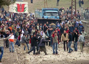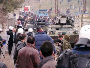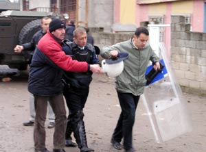 Yaklaşık bin kişi, polisin sis ve gözyaşartıcı gazla yaptğı müdahaleye taş ve sopalarla karşılık verdi.