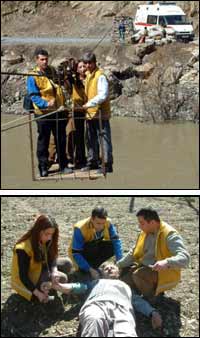Hakkaride, 112 Acil Servis ekipleri, aldıkları bir ihbar üzerine Üzümcü Köyüne gitmek için ölüme meydan okudu. Zap Suyunu ilkel teleferikle aşan ekip, tansiyonu yükselen hastayı tarlada bulup tedavi etti.