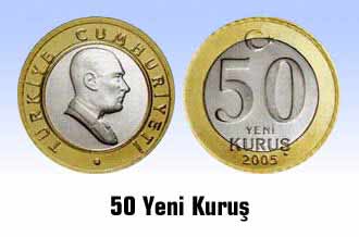 50 Kuruş’un çapı 23.85 mm, kalınlığı 1.95 mm, ağırlığı 7,000 gr. Kenarı aralıklı iri şekilde tırtıllı olan 50 Kuruş’un ön yüzünde ayyıldız, tedavül değeri, baskı yılı olan 2005, arka yüzünde,
