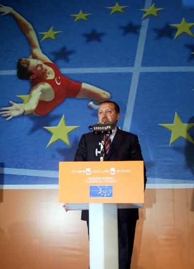 Hükümetin AB’ye üyelik yolculuğunun 2003 seçimlerinden bu yana sürdüğünü hatırlatan Erdoğan, o dönem 14 AB üyesi ülkeyi dolaştığını söyledi. Yaptığı geziler ve görüşmelerden sonra Kopenhag kriterlerine uyma çalışması başlattıklarına değinen Erdoğan, "Kamuoyunun desteği olmasa bu kadar kısa sürede bunu başaramazdık. 40 yıllık bayrak yarışında finişe az kaldı. Son 100 metreyi koşuyoruz. Verheugen ’Artık sizden isteyeceğimiz bir şey kalmadı’ diyerek geldiğimiz son noktayı açıkladı. MGK ve Doğu’da işkencede etkin adımlar malum. Bunlar 5-10 sene önce konuşulsaydı ’Böyle bir şey olmaz’ denilirdi. Fakat muhalefet, iktidar, halkımız, sivil toplum örgütleri el ele vererek en iyi neticeyi alıyoruz. AB artık, Türkiye’nin ev ödevini yapıp yapamayacağını tartışmayı çoktan bıraktı. Artık Türkiye’nin tüm koşulları hangi tarihte tamamlayıp AB üyesi olacağı tartışılıyor" dedi.