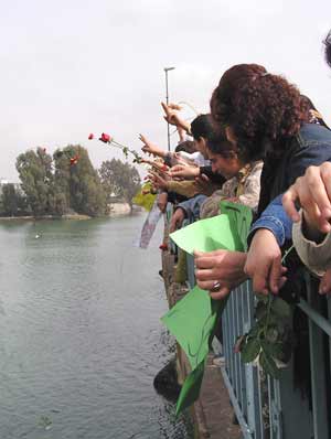 Daha sonra kadınlar, Taşköprü üzerine çıkarak zılgıtlar çekip, terör örgütü elebaşısı Öcalana ulaşması amacıyla ellerindeki çiçekleri Seyhan Nehrine bıraktı.