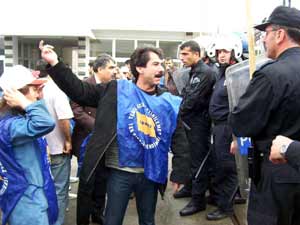 Polis, biber gazı ve cop kullanarak eylemcileri uzaklaştırmaya çalışırken, başbakan da otobüste el hareketiyle işçilere sitem etti.