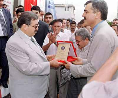 Vali Oğuz Kağan Köksal ile İnşaat Mühendisleri Odası Başkanı Sadi Sürenkök, katkılarından dolayı hayırsever işadamı Ömer Bayram’a birer plaket verdi.