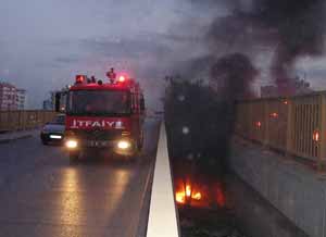 Edinilen bilgiye göre, olay Adana’nın merkez Seyhan İlçesi D-400 Karayolu üzerindeki Celal Bayar Köprülü Kavşağı’nda, saat 17.00 sıralarında meydana geldi. Köprülü Kavşağı’nın Çınarlı Mahallesi tarafındaki ayaklarının arasında kimin yaktığı belli olmayan kamyon lastiğinden yükselen duman ve alevler, çevrede korku ve paniğe sebep oldu. Köprüden geçen sürücülerin ihbarı üzerine olay yerine Adana Büyükşehir Belediyesi İtfaiye Müdürlüğü ekipleri yangına müdahale ederken, polis ekipleri de güvenlik açısından yolu bir süre trafiğe kapadı.