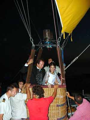 Rıdvan-İnci Ülker Aydın çifti Linda Otel’e Side üzerinden balonla geldiler. Gelin ve damadın balonla gelip düğün salonuna inişleri davetliler tarafından ilgiyle izlenirken, Belediye Kültür Müdürü Damat Rıdvan Aydın, kendileri için büyük anlam taşıyan bu güne değişik bir anlam katmak için böyle bir yola başvurduklarını belirterek, "Benim uçmaya karşı özel merakım var. Eşimin de işinin uçuşla ilgili olması nedeniyle böyle bir sürpriz hazırladık. Umduğumuzdan daha iyi oldu" diye konuştu.