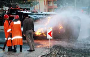 Kaza, bugün akşam saatlerinde meydana geldi. Edinilen bilgiye göre, Kemer-Kumluca Karayolu üzeri Çamyuva Beldesi mevkiinde, Antalyadan Kumluca istikametine gitmekte olan Recep Kemancı (25) yönetimindeki 07 V 2788 plakalı benzin yüklü tanker, virajı alamayarak aracın direksiyon hakimiyetinin kaybolması sonucu yan yatarak alev aldı.