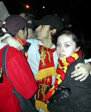 Daha sonra Cumhuriyet Caddesi’ni trafiğe kapatan topluluk, polisin uyarısıyla tramvay yoluna alındı. İnsanların arasına Galatasaraylı vatandaşların bulunduğu araçlarda girince, ilginç görüntüler ortaya çıktı. Otomobillerin önünü kesen Galatasaraylı taraftarlar, otomobillerin üzerine çıkarak sevinç gösterisinde bulundu.