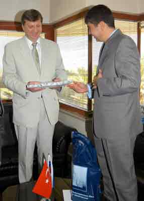 Rusya Federasyonu Antalya Konsolosu Sergey D. Alifanov ve Konsolos Muavini Sergey Shmakov, Antalya Büyükşehir Belediye Başkanı Menderes Türel'i ziyaret etti. Rus Konsolos Sergey D. Alıfanov, Atatürk Kültür Merkezi'ndeki makamında Antalya Büyükşehir Belediye Başkanı Menderes Türel'i ziyaret ederek, Başkan Türel'in 41. yaş gününü kutladı. Alıfanov, Başkan Menderes Türel'e konsolosluk binası çevresinde yapılan çevre düzenlemesi çalışmaları için de teşekkür etti. Başkan Türel, ziyaretten duyduğu memnuniyeti dile getirerek, "Rusya Federasyonu ile Türkiye Cumhuriyeti arasındaki zaten iyi olan ilişkiler, daha da güçlenerek devam edecektir" dedi. Başkan Türel ve Rus Konsolos Alıfanov, görüşme sonunda karşılıklı olarak birbirlerine hediye sundu.
