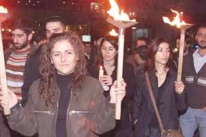Eğitim-Sen Antalya Şubesi’ne bağlı topluluk, Kışlahan Meydanı’nı doldurarak, yanlarında getirdikleri meşaleleri yaktılar.