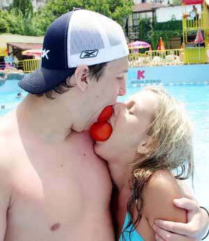 Aquaparkta düzenlenen etkinliklerden domates yeme yarışmasına büyük ilgi gösteren Rus turistler, tabaklardaki 4 adet domatesi en kısa sürede bitirmek için yarıştı. Aralarında çocukların da bulunduğu yarışmacılar, domatesleri önce bitirip ödül olarak verilecek votkayı kazanabilmek için mücadele etti. Yarışmayı kazanan Rus çift, birbirini kucaklayıp öperek kutladı.