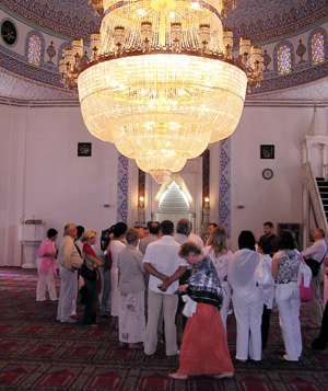 Camiye girileceği sırada şort ve etekli bazı Polonyalı bayanlar, Kaymakam Sarıkayaya "Böyle girmemizde bir mahsur var mı?" diye sordu. Mahsur olmadığını belirten Sarıkaya, heyette bulunanlara cami, İslamda ibadet ve Kuran-ı Kerim hakkında bilgiler verdi. Caminin 3 bin kişilik olduğunu ifade eden Sarıkaya, cemaatin imam arkasına saf tutarak namaz kıldığını söyledi. İncilin sağdan sola doğru okunduğunu belirten Sarıkaya, "Kuran-ı Kerim, tam tersine soldan sağa doğru okunur. İlahiyat fakültesi ve İmam Hatip Liselerinden mezun olan eğitimli imamlar yetişir" diye konuştu.