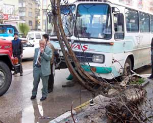 Antakyada, freni boşalan bir servis otobüsü, yayalara ve yoldaki diğer araçlara çarpmamak için elektrik direğine çarptı. Kaza Atatürk Caddesi üzerindeki Bayındırlık İl Müdürlüğü civarında öğle saatlerinde meydana geldi.