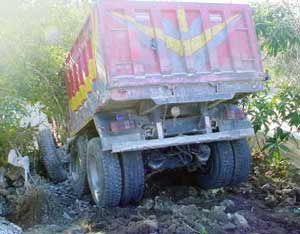 Belde içerisinde bulunan taş ocağından taş yükleyen kamyon, freni boşalınca cadde üstünde bulunan bir evin bahçesine girdi. Kamyon, evin önünde bulunan her şeyi önüne katarak sürüklerken, bahçede bulunan kum yığınına çarparak durabildi.