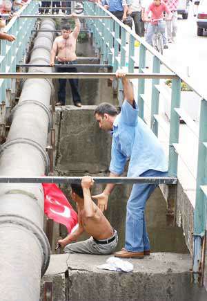 Ata köprüsünden kardeşi ile birlikte kendini atmakla tehdit eden Mahir Sülüoğlu, bu sırada Türk bayrağının da kardeşinin elinden alınması ile birlikte çılgına döndü.