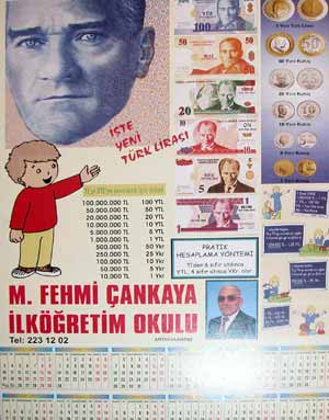 Antakya’da Mehmet Fehmi Çankaya İlköğretim Okulu, yeni yıl öncesi ilginç bir etkinliğe imza attı. Okul, çıkardığı YTL baskılı yeni yıl takvimleriyle hem okul bütçesine katkı sağlıyor, hem de yeni liraları tanıtıyor.