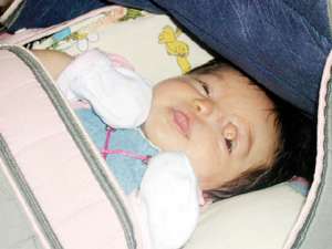 İskenderunda yaşayan Fatih-Özlem Hilmi çifti, burun deliklerinden biri sol gözünün üzerinde dünyaya gelen 5 aylık bebekleri Buse Nuru, sağlığına kavuşması için hastane hastane dolaştırıyor.