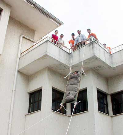 Tatbikat çerçevesinde binada mahsur kalan öğrenciler sedyeyle aşağıya sarkıtılırken, sedyenin üzerindeki çuvalın sıkı bağlanması nedeniyle bazı öğrenciler sıkışınca zor anlar yaşadı.