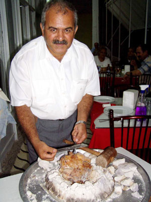 Reyhanlı'ya özgü tuzda tavuk, turistlerin ilgi odağı. 7 kilo tuz içerisinde tuzsuz olarak pişirilen tavuk, görenleri hayrete düşürüyor.
