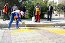 Şehir merkezinde araç trafiğinin yavaşlatılması için düzenlenen kasisler, gece daha rahat görülmesi için boyanıyor.