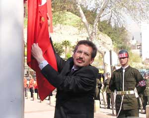 Atatürk anıtına çelenklerin konulmasının ardından Kahramanmaraş Belediye Başkanı Mustafa Poyraz, İstiklal Madalyasını Türk bayrağına taktı.