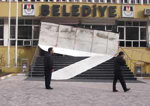 Çimen, belediyenin giriş kapısından geçerken, yukarıda bulunan ışıklı pano üzerine düştü.