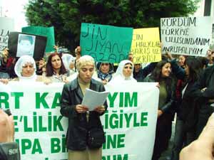DEHAP Kadın Kolları tarafından düzenlenen eylem, saat 12.00’de parti binası önünde toplanan kadınların Atatürk Caddesi’ne yürümesiyle başladı. DEHAP’lı kadınların, yürüyüşü "Kürt kadınıyım Türkiyelilik kimliği ile Avrupa Birliği’ne girmek istiyorum" yazılı pankartla yapmak istemesi, gerginliğe neden oldu. Polis, kadınların bu pankartı indirmesinden sonra yürümesine izin verdi. Yaklaşık 20 kadının katıldığı eylem, daha sonra Atatürk Caddesi Büyükşehir Belediye Binası önünde yapılan basın açıklamasıyla devam etti. DEHAP’lı kadınlar adına açıklama yapan Remziye Sarıca, Türkiye Büyük Millet Meclisi ve Avrupa Parlamentosu’na göndermek üzere hazırladığı bildiriyi okudu.