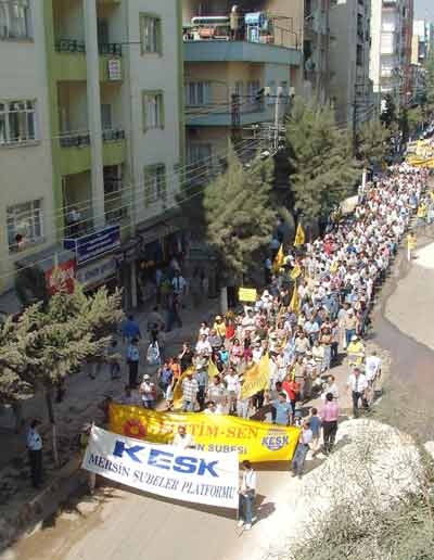 KESK’in Mersin Mitingi saat 12.00’de Devlet Hastanesi önünden yürüyüşle başladı. Petrol kirliliği ile mücadele eden Karaduvar Mahallesi sakinlerinin ön safı oluşturduğu yürüyüş ve mitinge yaklaşık 3 bin kişi katıldı.
