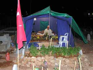Gece-gündüz devam eden hatim nöbeti biten görevli hoca, çadırda bulunan yatakta yatıp kalkıyor. Önünde Türk Bayrağı dalgalanan çadırın işadamı Mehmet Bayam’ın isteği ile yaklaşık 1 ay önce kurulduğu belirtiliyor. Çadır içerisindeki mezar başında gece gündüz Kur’an okuyup dua eden hocalardan Mehmet Kutlu, buradaki amacın sadece ölen kişinin ruhuna Kur’an okumak olduğunu belirterek, "Kur’an okunan yere rahmet hasıl olur" dedi.