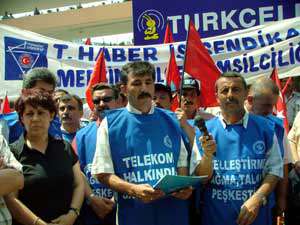 Türk-İşe bağlı Haber-İş Sendikası Mersin Şubesi, bugün gerçekleştirdiği eylemlerle Türk Telekomun özelleştirilmesini protesto etti. Türkiye Kamu-Sene bağlı Türk Haber-Sen üyeleri ile Türk-İş İl Temsilcisi Adil Alaybeyoğlu, BES Şube Başkanı Gürsel Sığınır ve Eğitim-Sen Şube Sekreteri Sinan Muşlunun da destek verdiği Türk Telekom çalışanları, saat 13.00 sıralarında Akdeniz Telekom İl Müdürlüğü önünde toplandı.