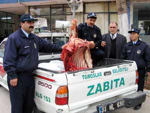 Mersinin alt birim Toroslar Belediyesi zabıta ekipleri, kaçak kesim olduğu belirlenen 100 kilo et ele geçirdi. Tüketime elverişli olmadığı belirlenen etler, ekipler tarafından imha edildi. Toroslar Belediyesi Zabıta Müdürü Bünyamin Doğan, et ve mamulü satışı yapan kasap ve diğer işyerlerinde yaptıkları son denetimlerde, mezbaha dışı kaçak olarak kesilmiş, mühürsüz 100 kilo büyükbaş hayvan eti ele geçirdiklerini bildirdi.