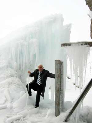 Daha sonra Murat Nehri üzerindeki buz tutan buz sarkıtlarının altına oturan Naci Aslan, kopardığı bir buzu kaleme benzeterek Ağrı’nın kaderini bu buzla yazdığını anlattı. Daha sonra kopardığı uzun bir buz sarkıtını baston olarak kullanan Aslan, zaman zaman düşme tehlikesi geçirdi.