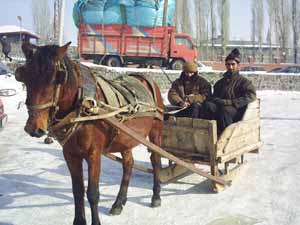 Ardahan’ın Tepesuyu Köyü’nden Cihan Güzel, arkadaşıyla birlikte yılbaşı akşamına hazırlık yapmak için atlı kızakla Ardahan’a geldi. Pazarda atını araçların yanına park edip, üşümemesi için üzerini kilimle örten Güzel, alışveriş yaptıktan sonra aldığı yiyecekleri kızağa yükleyerek köyüne doğru yola çıktı.