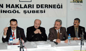 İnsan Hakları Derneği (İHD) Bingöl Şubesi’nce Yolcu Kardeşler İşhanı’nda ’AB ve İnsan Hakları’ konulu bir panel düzenlendi. İHD Bingöl Şube Başkanı Rıdvan Kızgın’ın yönettiği panele eski SP eski Genel Başkan Yardımcısı Prof. Dr. Mehmet Bekaroğlu, İnsan Hakları ve Mazlumlar İçin Dayanışma Derneği (Mazlum-Der) Van Şube Başkanı Abdulbasit Bildirici ile İHD Doğu ve Güneydoğu Anadolu Bölge Temsilcisi Mihdi Perinçek konuşmacı olarak katıldı.