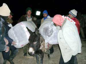 Bingölün Karlıova İlçesinde kar ve çamur nedeniyle yolu kapalı olan Sarıkuşak köyüne, depremin 6. gününde at ve eşekler sırtında yardım malzemeleri ulaştırıldı.
