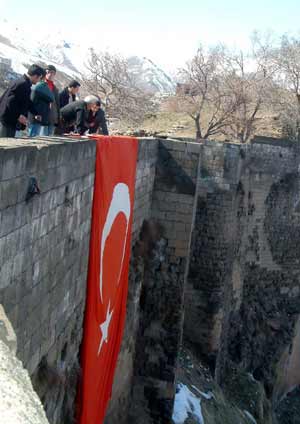 Nevruz kutlamaları sırasında Mersinde Türk bayrağına yapılan saldırı nedeniyle Bitlis Kalesine dev bayrak asıldı.