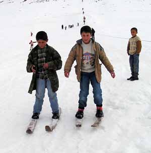 Çocuklar, kara lastiklerinin altına yerleştirdikleri tahta kayaklarla karın keyfini çıkarıyorlar. Kayak malzemelerinin çok pahalı olduğunu söyleyen Ünal Dinç, ailelerinin bunları almaya maddi güçlerinin yetmediğini belirterek, "Maddi durumumuz iyi değil. Pahalı kayak malzemesi alamıyoruz. Babalarımız da bize tahtadan yaptı. Eğer bizde kayak malzemesi olsaydı çok daha güzel kayardık" dedi.