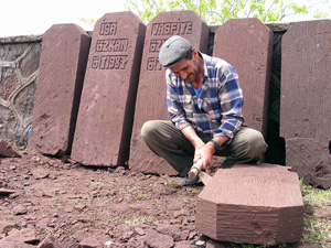 Bitlis’in Güroymak İlçesi Esentepe Mahallesi’nde yaşayan 47 yaşındaki Hasan Kurtdenör ile 50 yaşındaki İsmail Saknok, Ahlat taşından işleyerek yaptıkları mezar taşlarından geçimlerini sağlamaya çalışıyorlar. 23 yıllık inşaat ustası olduğunu söyleyen Kurtdenör, inşaat sektöründe yaşanan sıkıntılar nedeniyle meslek değiştirmek zorunda kaldığını belirtti. Kurtdenör, 7 yıldır Ahlat taşından mezar taşı yaparak geçimini sağladığını ifade ederek, "Ben 9 nüfusa bakıyorum. 23 yıl duvar örme ustalığını yaptım. Ancak işler iyi olmayınca mezar taşlarını yapmaya karar verdim ve 7 yıldır bu işi yapıyorum. Aşağı Kolbaşı Köyü’nde tanesini 4 milyon liraya aldığımız taşlarının üzerine, değişik desen ve isimler yazıyoruz. Bir mezarı 150 milyon liraya 4 günde bitiriyoruz" dedi.