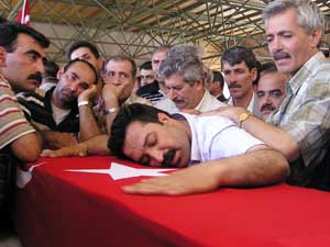 Yoğun güvenlik önlemleri altında kılınan öğle namazında şehitler için dualar edilirken, Milli Savunma Bakanı Vecdi Gönül gözyaşlarına tutamadı. PKK terör örgütü aleyhine sloganlar atıldığı cenaze töreninde, bazı vatandaşlar tarafından SHP Genel Başkanı Murat Karayalçın protesto edildi. Tepkilerin sürmesi üzerine Karayalçın, herhangi bir olay çıkmaması için güvenlik kuvvetleri tarafından alandan uzaklaştrıldı.