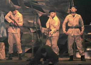Savaşın en masum umutları ve hayalleri yok eden ve insanı hayvanlaştıran çirkinlik organizasyonu olarak anlatıldığı oyunun finalinde bütün oyuncular askeri palaskalarla kendilerini temsili olarak asarak intihar ediyor.