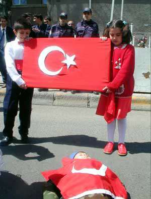 Yerde yatan şehit askerin üzerini Türk bayrağıyla örten küçük öğrenciler, "Vatan bir bütündür, asla bölünemez" sloganları attı.