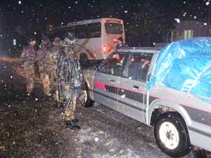 Erzurum’dan Çat ve Bingöl istikametine giden araçlar, kar ve tipi nedeniyle Çat yolu üzerindeki Özel Harekat Şube Müdürlüğü önünde görevli Trafik ekipleri tarafından bekletiliyor. Sürücülere yoğun kar yağışı ve tipi nedeniyle yolun kapandığını bildiren ekipler, araçların geçişine izin vermiyorlar.