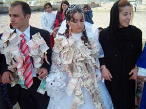 Yüksekova'nın Dilekli Köyünde evlenen bir çift, misafirler tarafından hediye yağmuruna tutulurken, damat ve geline adeta paralardan elbise giydirildi.