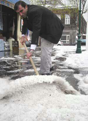 Kaldırım ve caddelerde yaklaşık 6 santimetre yüksekliğinde biriken dolu yığınlarını temizlemekte zorlandı.