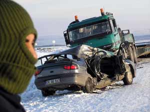 Kaygan yolda kontrolden çıkan otomobil tırın altına girdi. Korkunç kazada bir kişi öldü, 2 kişi yaralandı. Kaza, Digor ilçe merkezine 5 kilometre mesafede öğle saatlerinde meydana geldi. Casim Erol idaresindeki 06 GG 547 plakalı otomobil, kaygan yolda kontrolden çıkarak Kars istikametine gitmekte olan DSİ’ye ait Hasan Yılmaz’ın kullandığı 36 AZ 928 plakalı TIR’ın altında girdi.