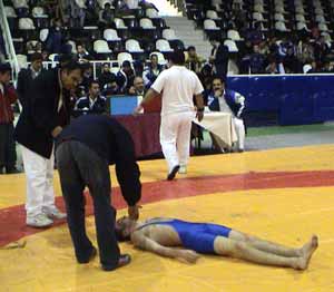 Bu hamle sonrasında Suat Yalçınkaya, rakibini salto ile yere atmanın sevcinci ile minderin ortasına doğru giderken, Eren Korkmaz ise düştüdüğü yerde kaldı. Durumu gören yöneticilerden birisi hemen müsabaka alınına girerek Eren Korkmaz’ı sırt üstü yatırdı. Salonda doktor bulunmaması nedeniyle bir görevli hemen 112 acil servisi arayarak yardım talebinde bulundu. Minderde dakikalarca acıyla kıvranan Eren Korkmaz sırt üstü yatarken, hakem ise diğer oyunucu Suat Yalçınkaya’nın elini kaldırarak maçın galibi ilan etti.
