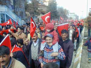 bu haberi okurken gözüme şu yazı takıldı körtler bayrağı ayakar altında almış bu bayrak hepimizin ve şehitlerimizin ama bunu yapan kendilerini pilir bir propaganda olduğuna inanı yorum ve bunu yapan çocuk:diyor ki:bize bayrakları takım elbiseli biri leri verdi ,aca bunlar kimdir bunu n bilincinde olalım :ayrıca bunu yapan çocuklar :biri:DEHAPlı biriside MHP li olduğu söyleniyor size düşen bunu biraz mantıklı bakmanız saygılarım la