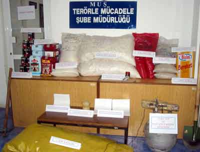Yakalanan teröristin gösterdiği sığınaklarda ise 140 kilogram şeker, 17 kilogram çay, 23 kilogram salça, 40 kilogram toz şeker, 30 kilogram pirinç, 30 kilogram bulgur, 40 metre naylon, 17 kilogram yağ, bir adet kazma, 1 adet kürek, 10 adet elektrikli fünye, bomba yapımı ile ilgili bilgilerin bulunduğu kağıtlar, 12 kilogramlık büyük mutfak tüpü üzerine yerleştirilmiş baskılı düzenekte yaklaşık 500 kilogram C-4 patlayıcı madde ele geçirildi.